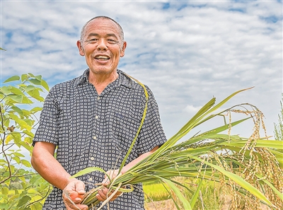 四川彭州市敖平鎮(zhèn)農(nóng)民展示由湔江堰灌區(qū)的水澆灌長成的水稻。