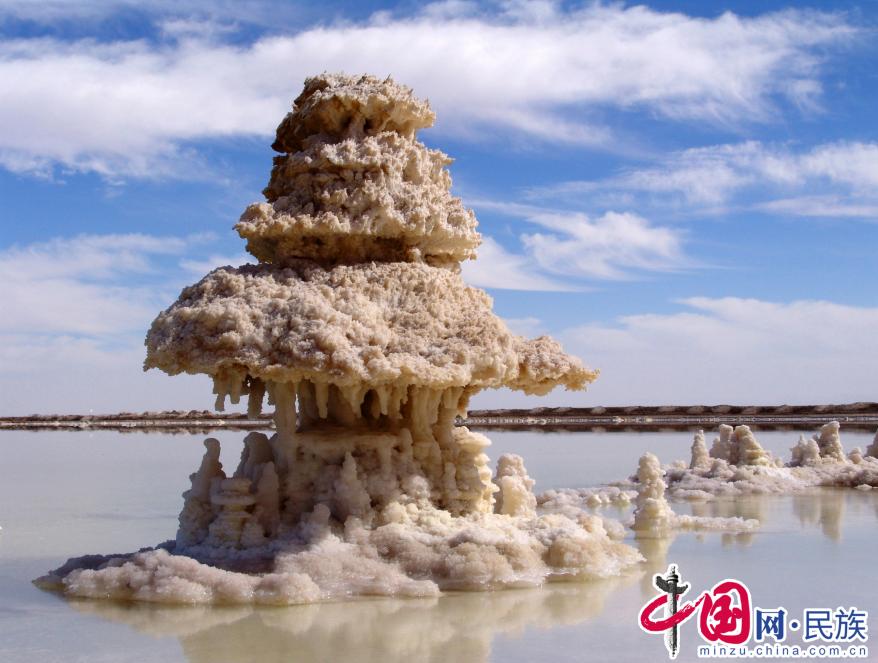 自然偉力下,高原隆升到足以阻隔南來暖濕氣流的高度,氣候日趨干旱,蒸發(fā)量是降水量的150多倍,就像一口巨大的蒸鍋,水分蒸發(fā)、湖泊干縮、咸化,大量鹽類開始在盆地中沉積下來,同時在干旱氣候的作用下,湖內(nèi)高濃度鹵水逐漸結(jié)晶成鹽,最終形成了現(xiàn)在的一個個鹽湖。
