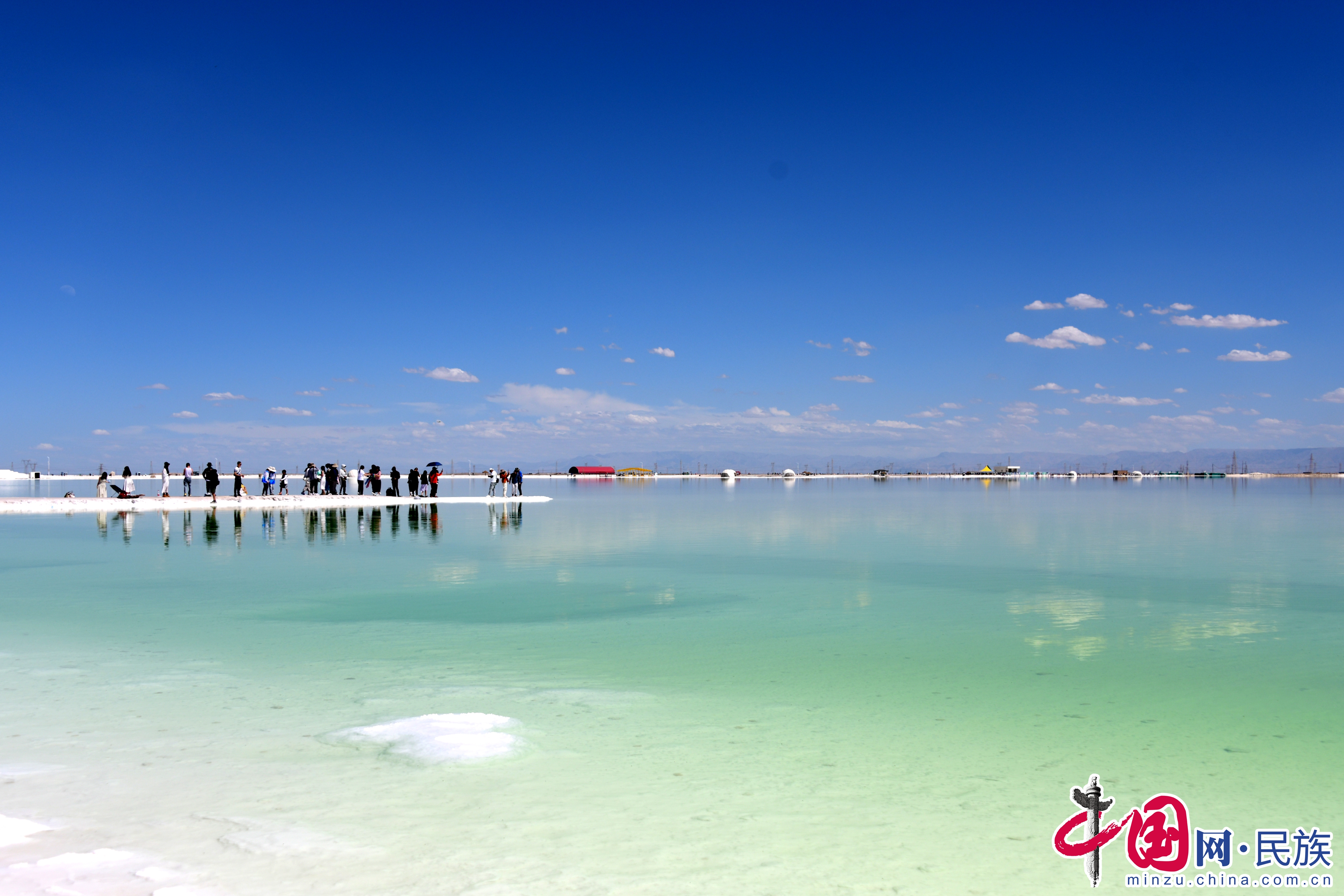 游客在察爾汗鹽湖游玩。蔡得軍攝