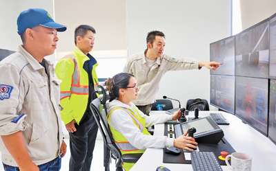 春節(jié)期間,秘魯錢凱港的中秘員工仍堅(jiān)守崗位。這是兩國員工在遠(yuǎn)程操控設(shè)備。