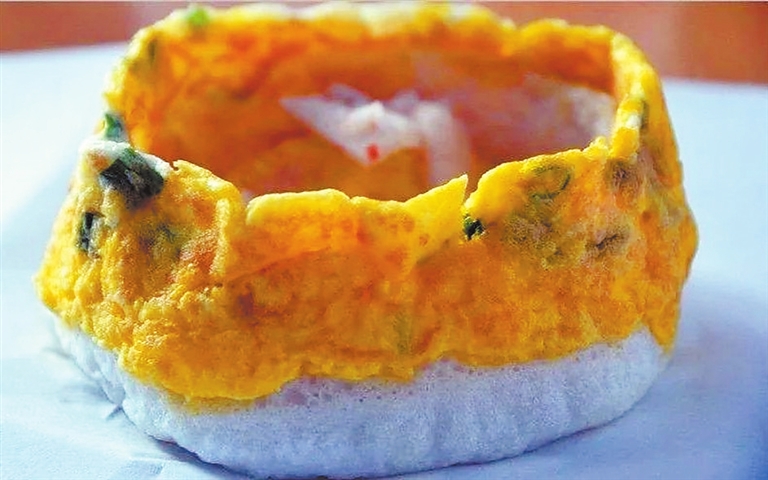 “不翻兒”名字的由來(lái)還有另一層意思。濟(jì)源地處黃河最后一道出山口,水流兇猛。古時(shí)的漁民最怕翻船,為了祈求平安,將隨身攜帶的這種面食稱為“不翻兒”,寄托著漁民對(duì)美好、平安的向往。“不翻兒”色澤鮮亮,上層雞蛋燦黃如金,下層米面潔白如玉,中間較薄酥脆無(wú)比,外圍較厚噴香撲鼻。