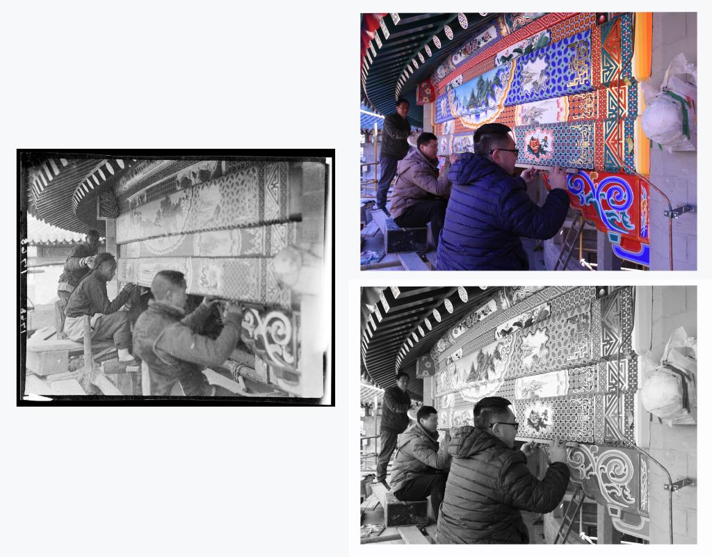 用一周時(shí)間徹底剝離一根存在安全隱患的電線;將修復(fù)后的彩畫照片調(diào)成黑白,和百年前圖片反復(fù)比對(duì)調(diào)整;歷時(shí)一年半研究恢復(fù)院門口石獅子的歷史位置……