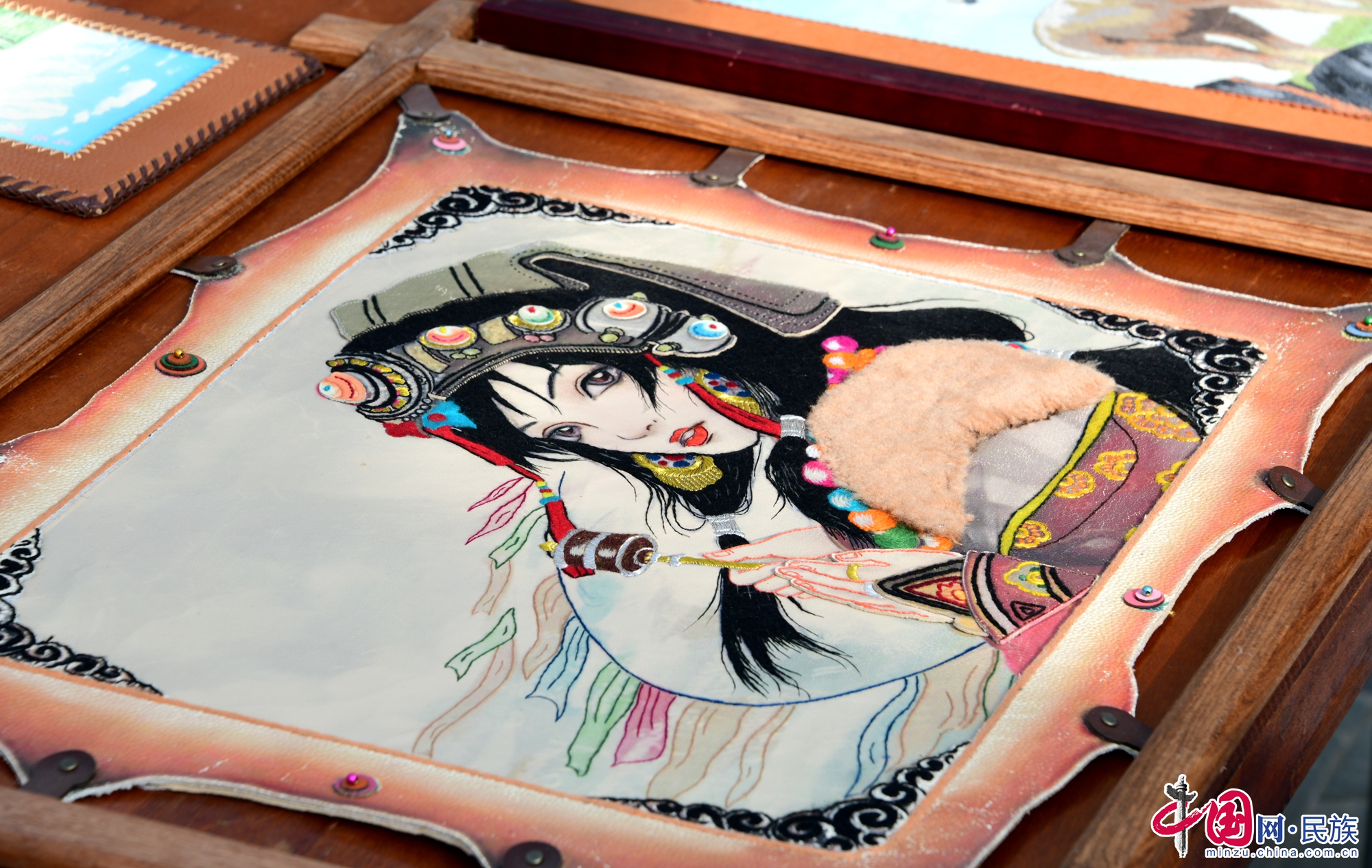 丹噶爾皮繡問世后,我們經(jīng)過多方面的改良,讓這項非遺展現(xiàn)出獨特藝術魅力。在創(chuàng)作題材上進一步擴大,涵蓋自然景觀、民俗風情、神話傳說等多個方面。在絲線和針法的選擇上,用毛線、皮繩、馬鬃及絲、絨、棉等多種顏色的繡線,運用平繡、網(wǎng)繡、盤金繡、拉鎖繡等針法,并根據(jù)不同題材、不同物象、不同紋理、不同要求,構(gòu)成各種優(yōu)美的圖像、花紋,再加上結(jié)構(gòu)虛實結(jié)合,明暗對比,增強作品的真實性和立體感。