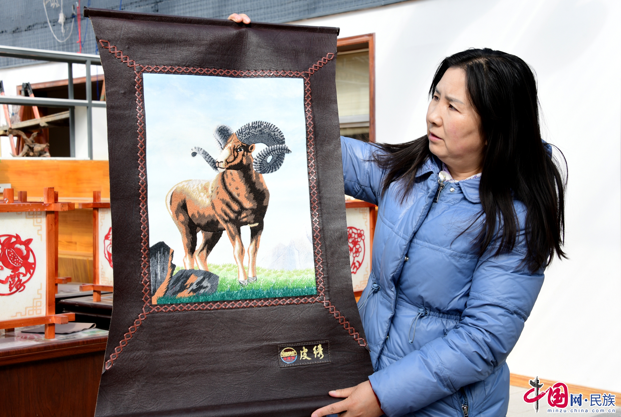 為了掌握皮繡技藝,我們下了苦功夫。采用牛皮、羊皮、兔皮、鼠皮以及牛毛、羊毛、馬尾、人發(fā)等天然原料,經(jīng)特殊處理加工成皮條、皮繩及毛線、毛繩等材料,運用盤、編、攢、堆、繡等制作工藝,在傳承民間皮藝工藝基礎上,將其發(fā)展成新型文化產(chǎn)品。經(jīng)過兩年多反復實驗,嘔心瀝血,終于研制出有地域特色的皮繡作品。