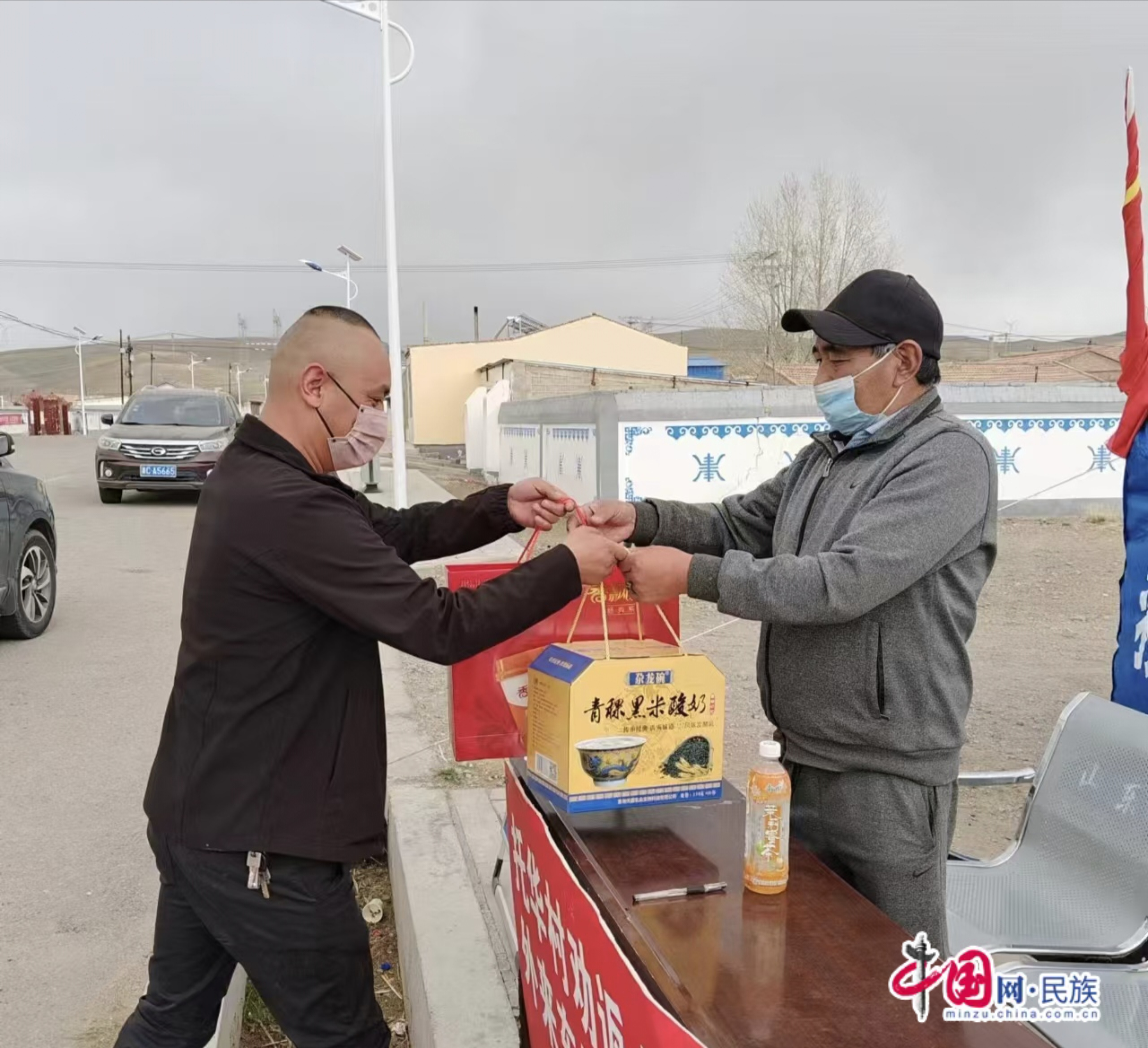 疫情期間,元才為過往司機(jī)提供物品。海晏縣委宣傳部提供