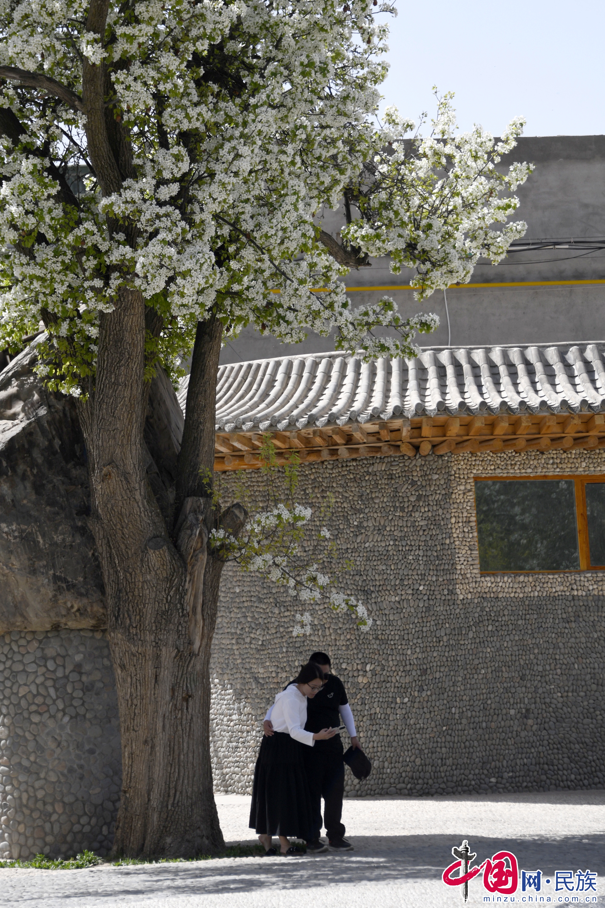 游客在貴德縣奇石苑的梨花樹下拍照。蔡得軍攝