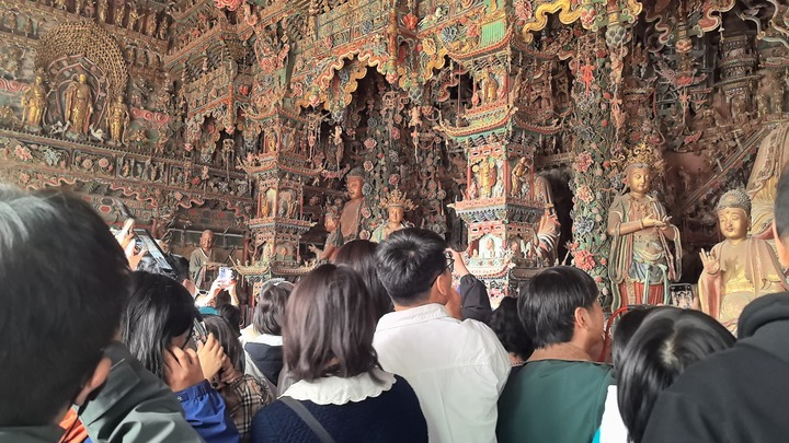 游客在山西省隰縣小西天景區(qū)欣賞滿堂懸塑。(2024年10月5日拍攝)新華網(wǎng)發(fā)(劉英攝)