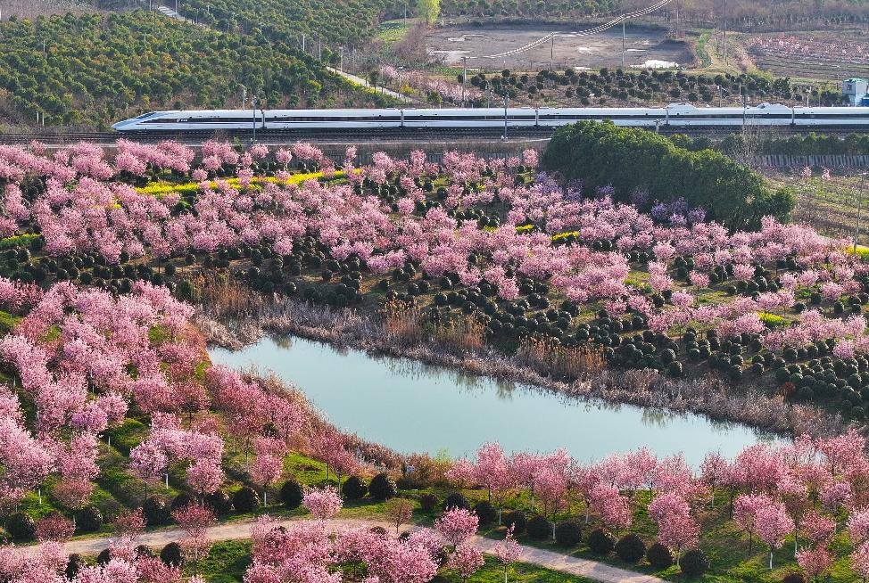 2025年3月19日,一列高鐵列車行駛在安徽省合肥市肥東縣長臨河鎮(zhèn)合福高鐵線路上(無人機(jī)照片)。新華社記者杜宇攝