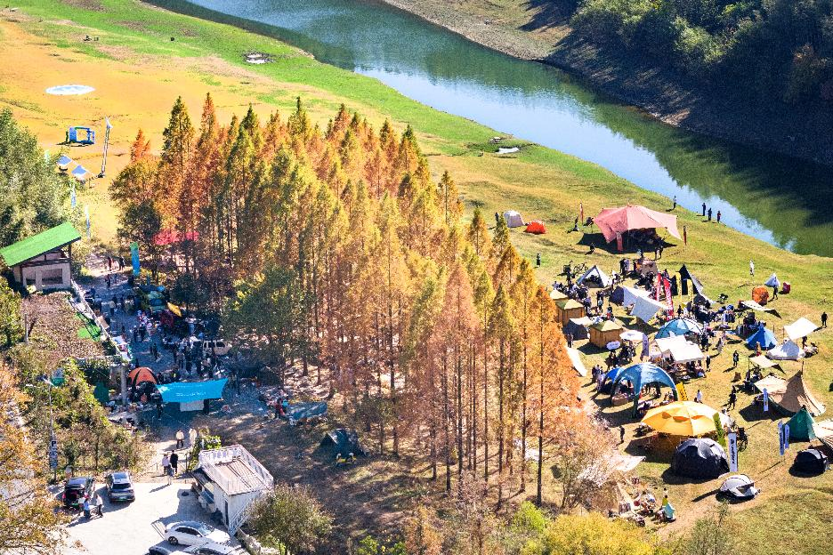 游客在安吉夏陽村的露營地里休閑游玩(2024年11月30日拍攝,無人機(jī)照片)。新華社發(fā)(潘學(xué)康攝)
