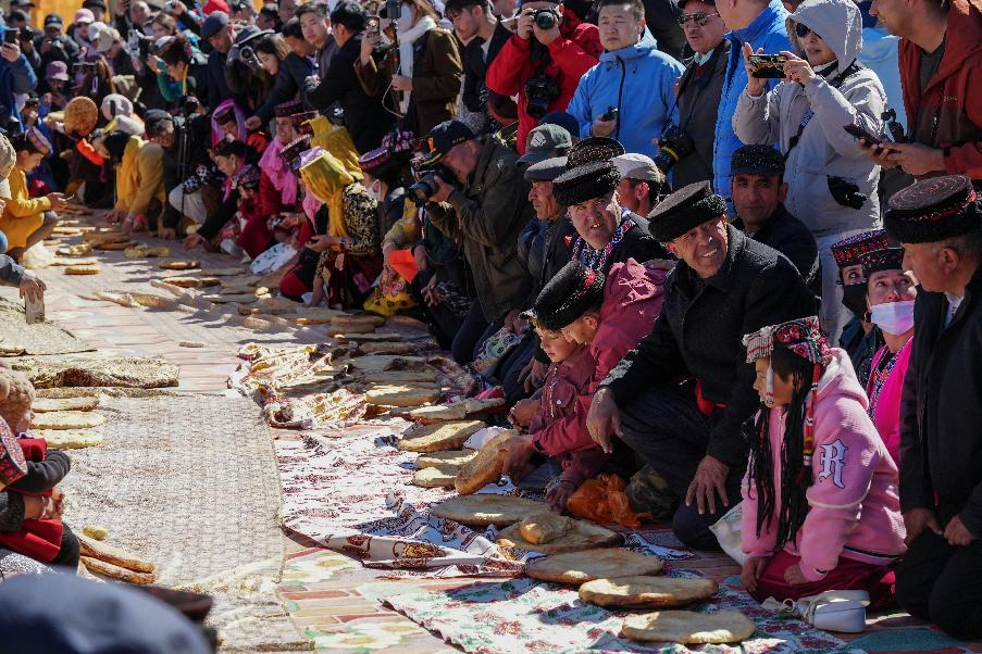2025年3月22日,在新疆塔什庫爾干塔吉克自治縣“彩云人家”民俗村,當(dāng)?shù)卮迕衽c觀眾分享食物。新華社記者徐宏巖攝