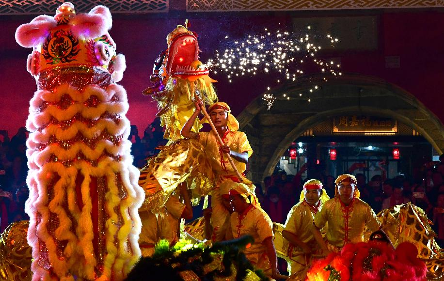 2025年福建省莆田“尾暝燈”文藝踩街活動舉行。這是活動開場的舞龍舞獅表演。(2025年2月26日攝)新華社記者魏培全攝