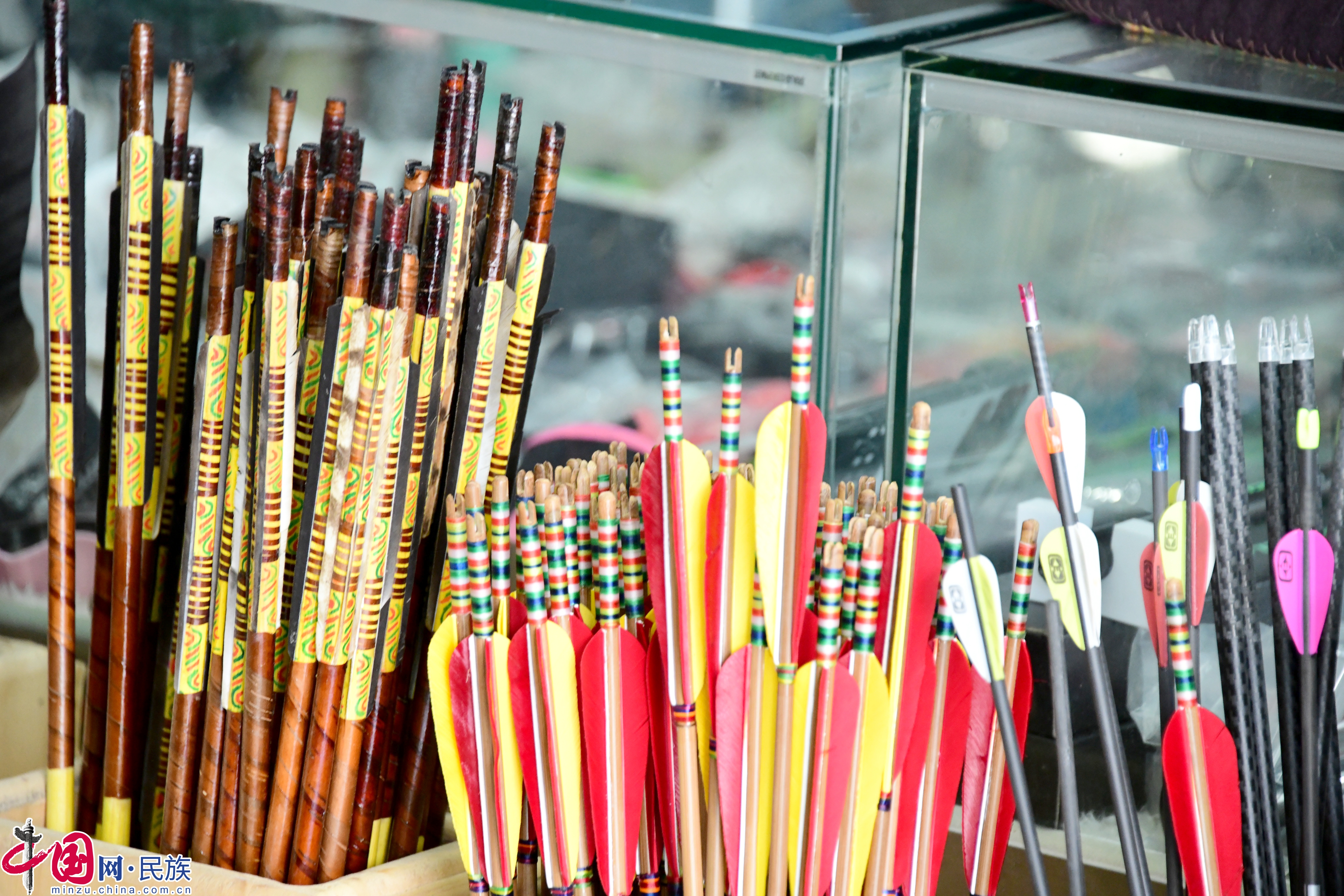 初見(jiàn)洋專,她正握著一支還未完工的箭支,向來(lái)訪的游客介紹。一旁的柜臺(tái)上,各式各樣的弓箭錯(cuò)落擺放,從古樸的牛角弓、木質(zhì)箭,到融入現(xiàn)代設(shè)計(jì)的競(jìng)技弓,每一件都透著尖扎與射箭的深厚羈絆。陽(yáng)光灑在地面反射照耀在弓和箭上,那原本就打磨得光滑的弓身箭桿,在光影中盡顯威嚴(yán)。